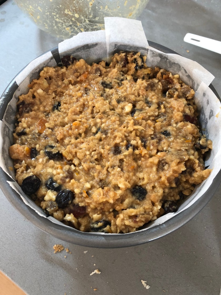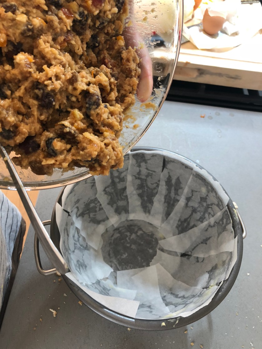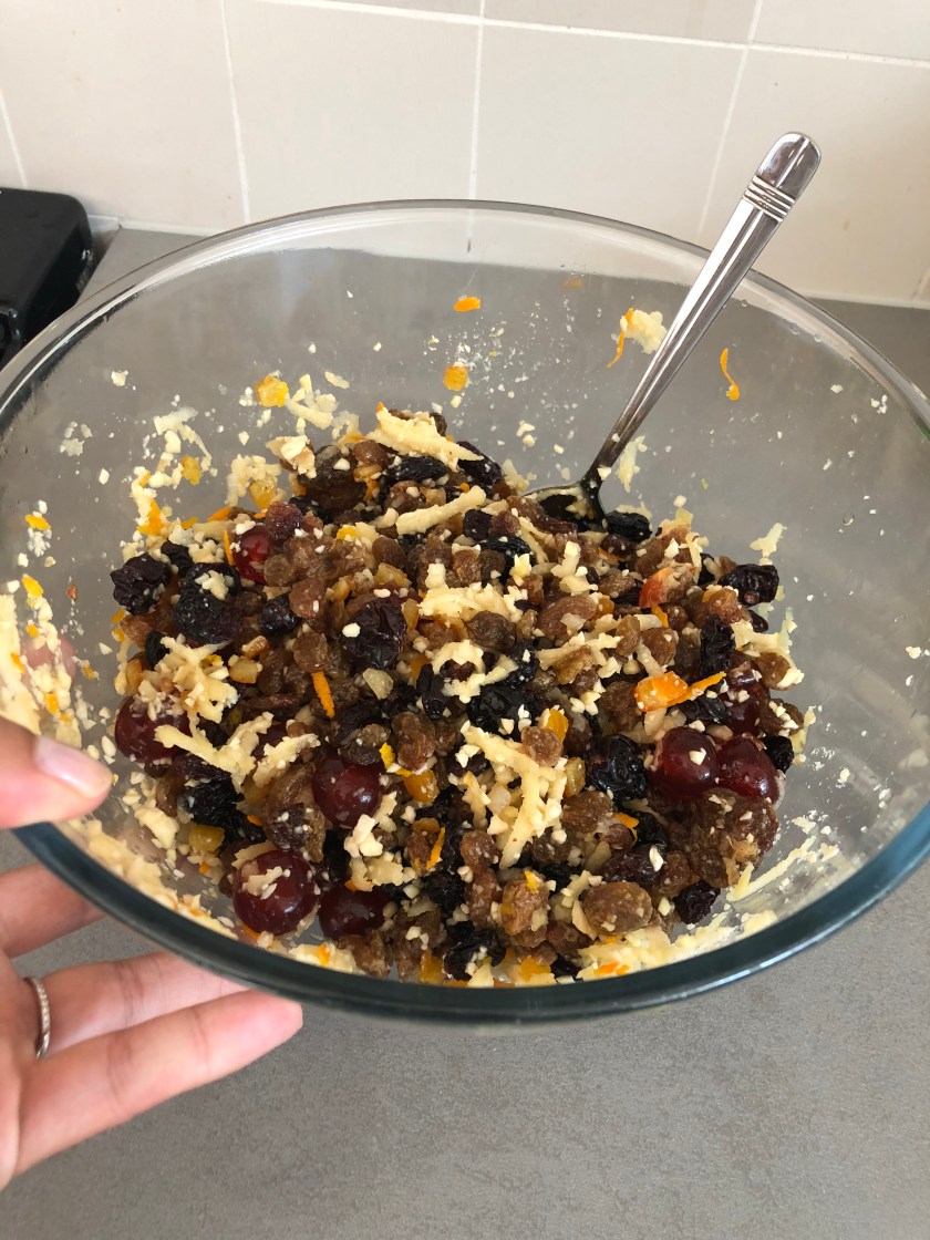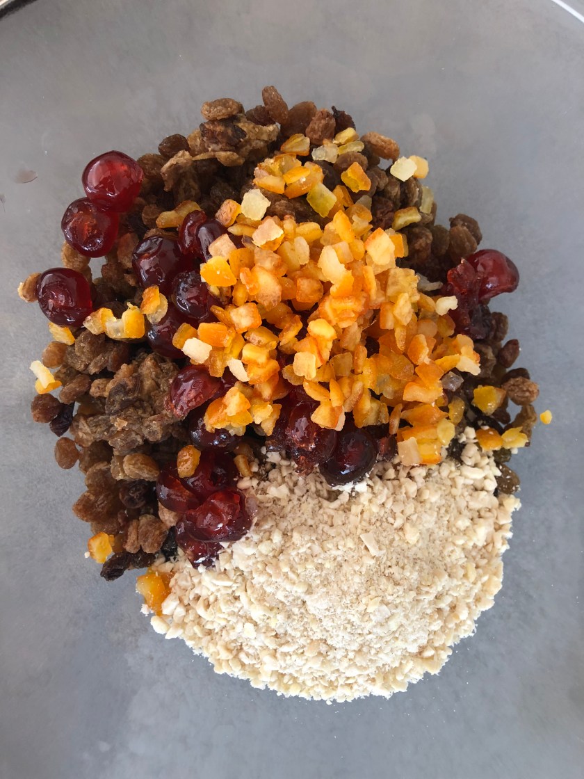 Prepared the dried fruit by removing the seeds and finely chopping the raisins. Combine in a bowl with almonds and the mixed peel (I add glacΓ© cherries sometimes too).