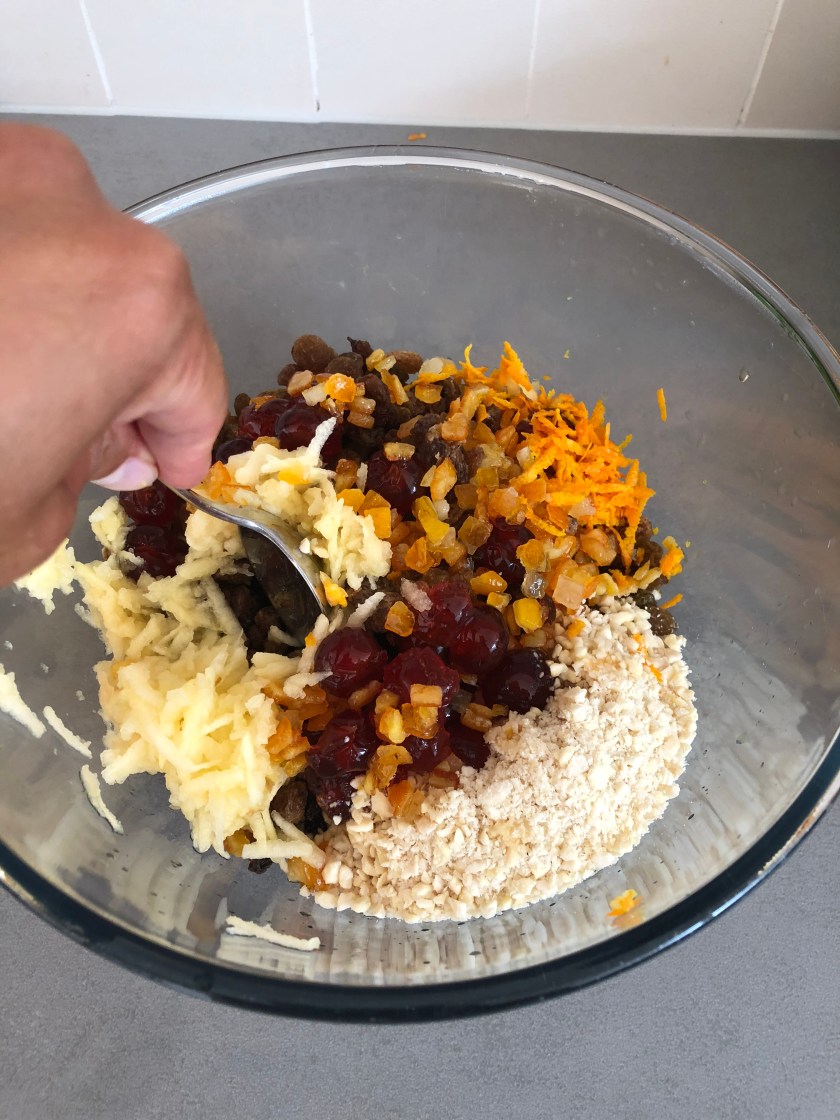 Peel and grate the Apple, grate the rind and remove the juice from half an orange. Add to the dried fruit and toss well.